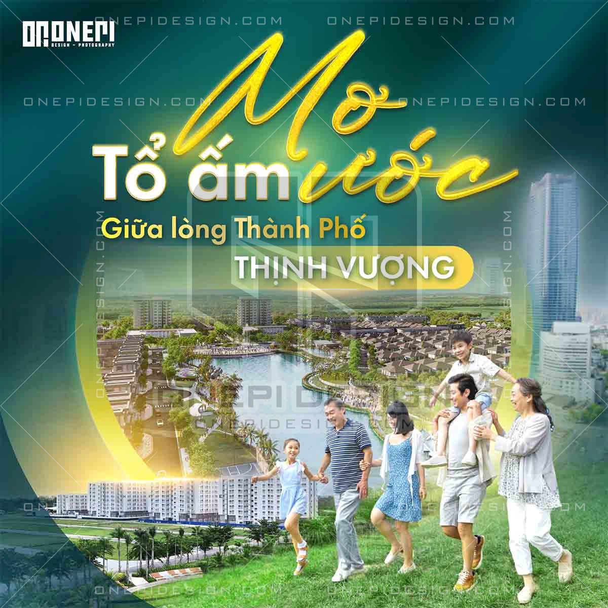 Mẫu Key Visual bất động sản “Tổ Ấm Mơ Ước Giữa Lòng Thành Phố Thịnh Vượng” được thiết kế bởi ONEPI DESIGN, mang đậm hơi thở hiện đại, hạnh phúc và cao cấp.