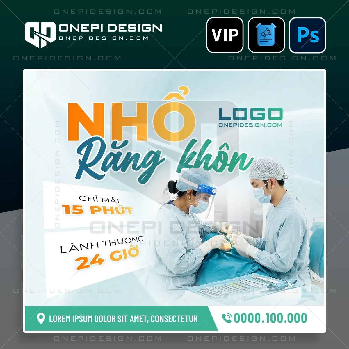 Để thuyết phục bệnh nhân, file psd poster nha khoa nhổ răng khôn đã trình bày thông điệp cực kỳ sắc bén. Hai yếu tố “Chỉ mất 15 phút” và “Lành thương 24 giờ” được đóng khung nổi bật để đánh trúng tâm lý khách hàng.